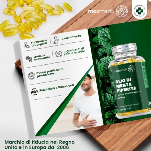Le Softgel di olio di menta piperita sono uniche sul mercato grazie alla loro formula da 200 mg e al formato in softgel. Ogni confezione contiene ben 365 capsule che coprono un anno intero di utilizzo per un rapporto quantità/prezzo imbattibile. Puoi risparmiare ancora di più acquistando 2 o 3 confezioni grazie agli sconti multipack.Inoltre, puoi utilizzarle in tutta sicurezza grazie alla Garanzia Soddisfatti o Rimborsati di WeightWorld.